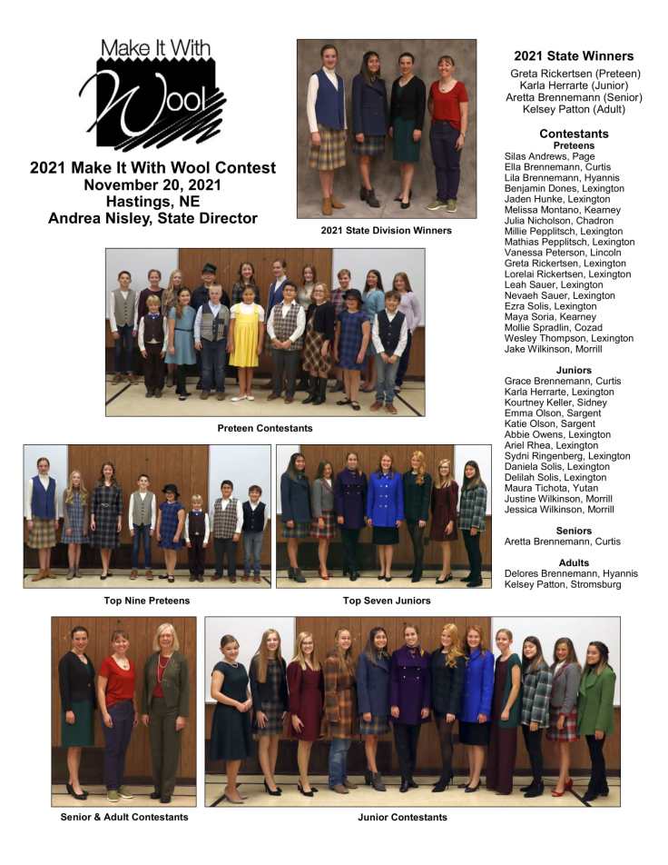 In the Preteen Division, the first place winner was Greta Rickertsen, Lexington who received a sewing basket with sewing notions. Second place winner was Jaden Hunke, Lexington; third place, Maya Soria, Kearney; fourth place, Nevaeh Sauer, Lexington; fifth place, Mathias Pepplitsch, Lexington; sixth place, Mollie Spradlin, Cozad; seventh place, Silas Andrews, Page; eighth place, Benjamin Dones, Lexington; and ninth place, Ezra Solis, Lexington. Other preteen contestants were Ella Brennemann, Curtis; Lila Brennemann, Hyannis; Melissa Montano, Kearney; Julia Nicholson, Chadron; Millie Pepplitsch, Lexington; Vanessa Peterson, Lincoln; Lorelai Rickertsen, Lexington; Leah Sauer, Lexington; Wesley Thompson, Lexington; and Jake Wilkinson, Morrill.